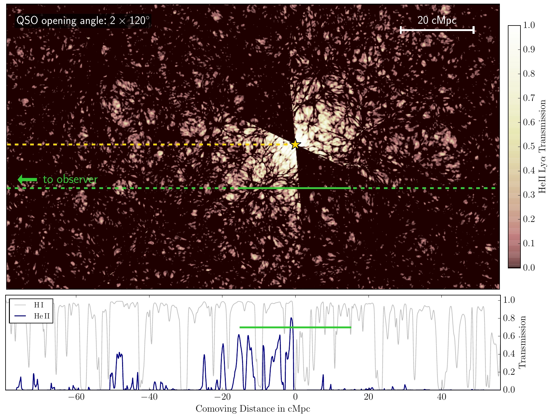 However, among the four foreground quasars with the highest HeII photoionization rates, three did not show any impact on the background sightline, letting us speculate that these might be either very young or highly obscured. I therefore developed a detailed numerical model of the HeII proximity effect that incorporates light travel time effects, finite quasar ages and quasar obscuration (Schmidt et al. 2018). It is based on outputs from one of the largest cosmological hydrodynamical simulations (Nyx, L100_N4096, Almgren et al. 2013, Lukić et al. 2015) and post-processed with a semi-numerical, fluctuating HeII UV background (Davies et al 2017) to which the radiation of single, isolated foreground quasars with variable quasar age and obscuration was added. An example of this is shown in the above figure. The quasar has similar luminosity to the foreground quasar in the Q0302-003 prototype case and the background sightline is placed at a similar separation. A strong impact on the HeII Lyα transmission in the IGM (top panel) and a clear signature in the HeII spectrum along the background sightline (bottom panel) are visible. I have assumed that the quasar illuminates only half of the sky and is obscured towards other directions, leading to the bi-conical shape. The exact shape and structure of the proximity region therefore depends on the orientation of the quasar, the amount of obscuration and its age. Clicking on the plot leads to a video that illustrates the expansion of the quasar proximity region with time, but for simplicity does not include obscuration effects.